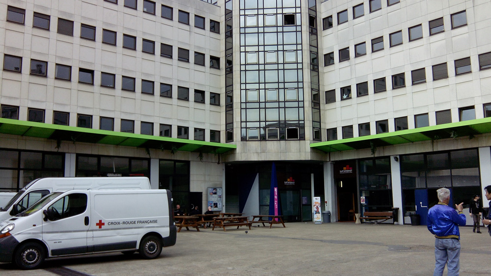 Arrivés devant le 24 rue Pasteur (l’entrée du bâtiment principal, pas l’habituelle), nous sommes étonnés par le calme, que dis-je le vide près de la grille ! Heureusement qu’un peu de staff (caisse, fouille et tampon) était là pour signifier que la convention light se tenait bien !